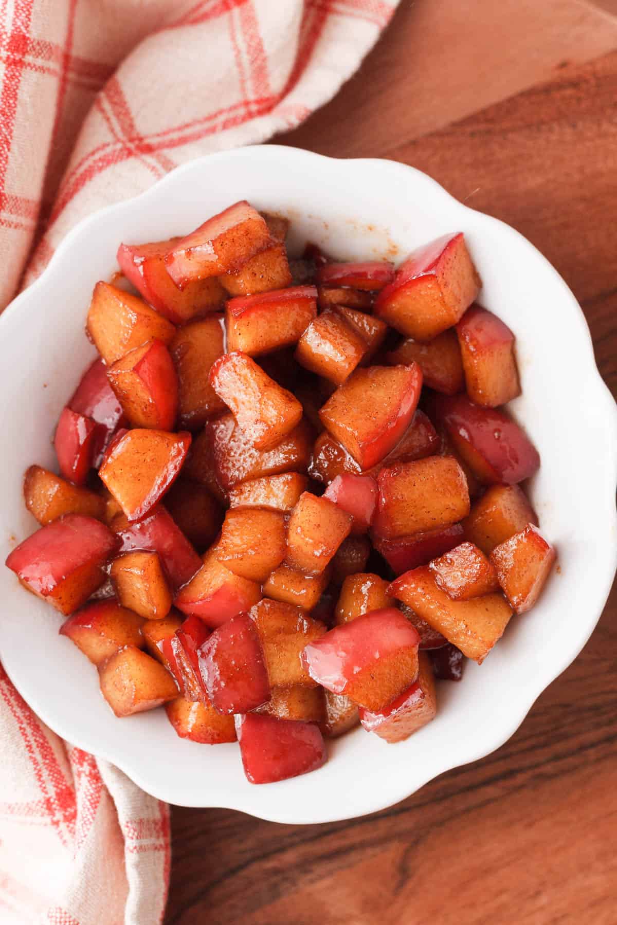 - Add diced apple and stir to coat. Allow to cook in the caramel sauce for 3-5 minutes, or until apples are fork tender and the sauce is a syrupy consistency.