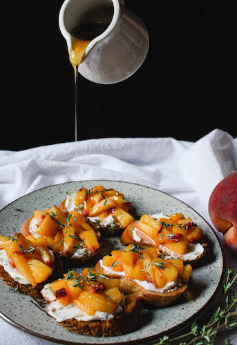 - Remove crostini from oven and peach-honey mixture from heat. Allow crostini to cool for a few minutes.