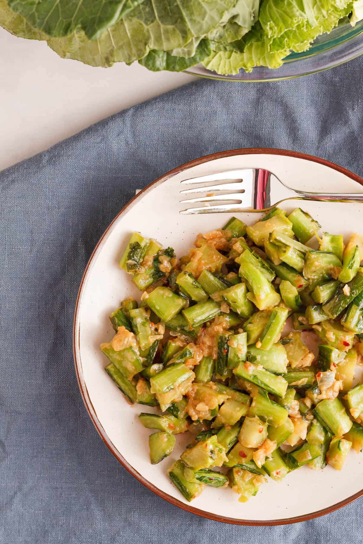 If you're wondering what to do with your collard green stems, the simple answer is save and sauté them! The crunchy centers of these leafy greens are versatile, nutritious, and make a delicious side dish!