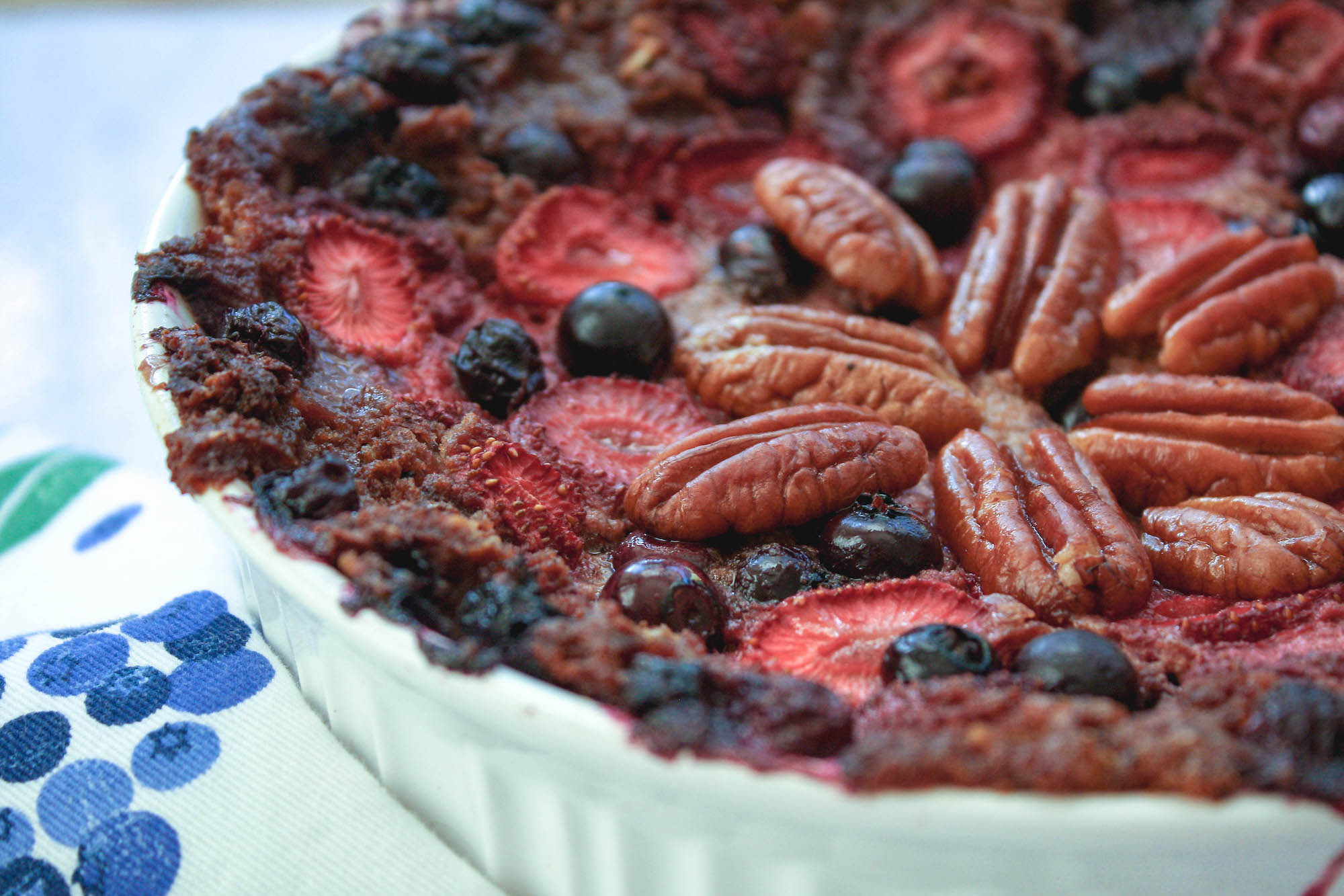 On non-cheat days, we do enjoy slow cooker steel cut oats since it's so easy to just leave them to cook overnight and wake up to the smell of cinnamon, bananas - whatever flavor combo we decide to use that day. Plus, it makes leftovers in our house, which is an added time-saver for busy days! That's where this summer berry baked oatmeal recipe enters the picture. I envisioned a cross between a coffee cake and the slow cooker oatmeal recipe, but highlighting ripened summer berries and pecans, given the time of year. It's fun to try new things!